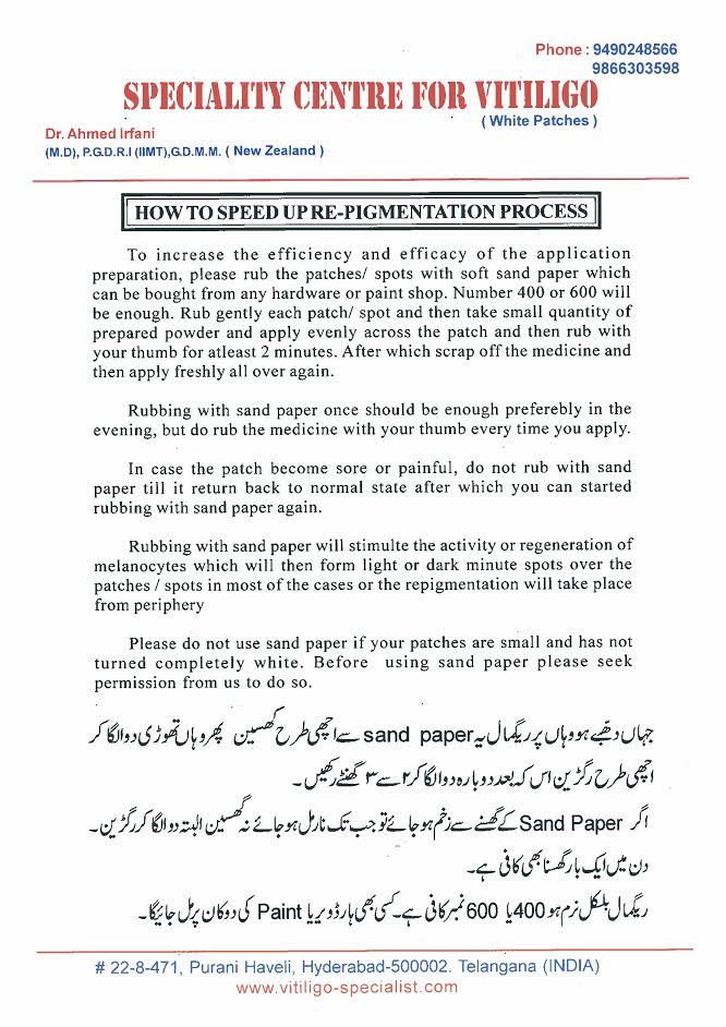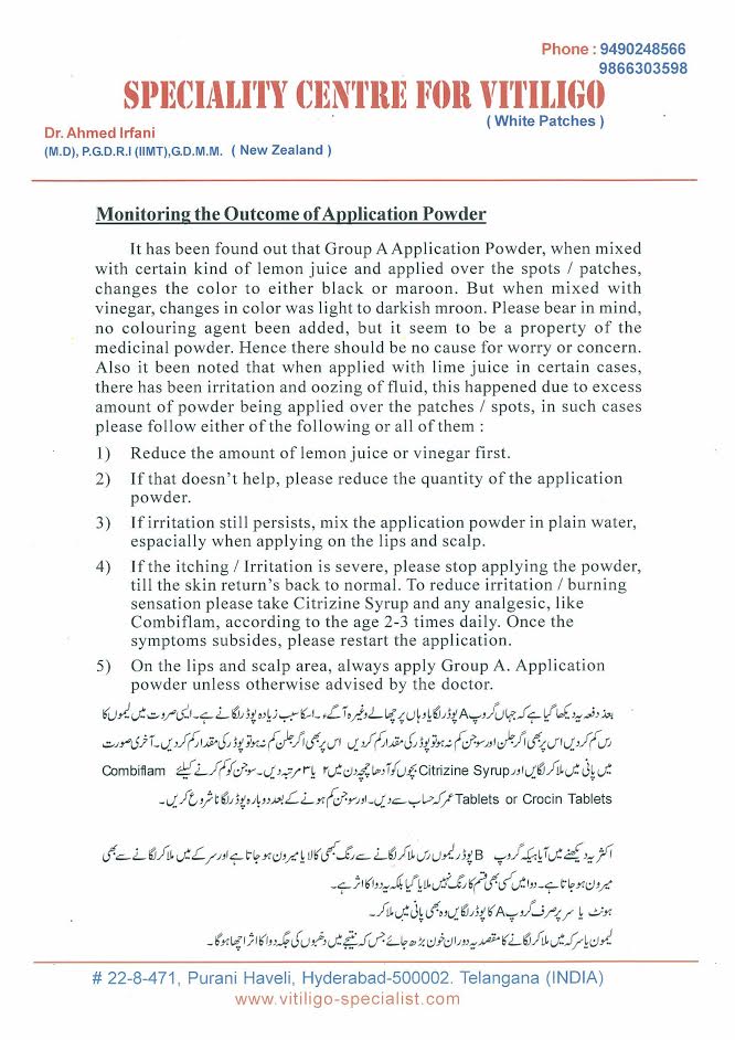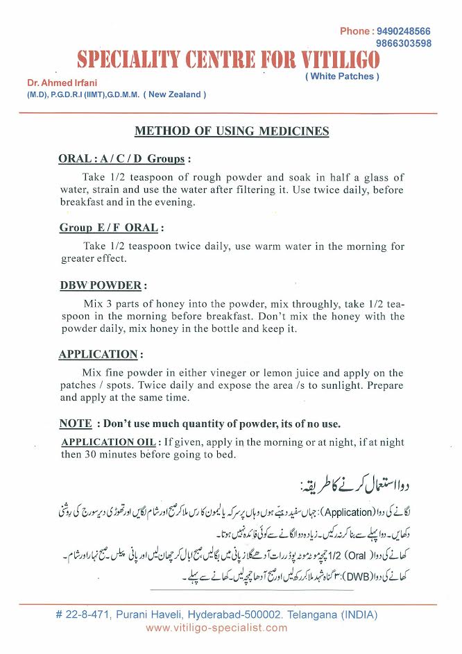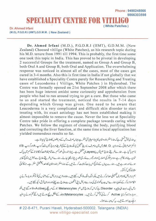 During his tenure as a research scholar doing M.D. at Govt. Nizamia Unani Medical College & Hospital, from 1991 to 1994, Dr. Ahmed Irfani took Vitiligo as his topic and set forth in formulating, researching new herbal medicines for a successful cure. This has proved to be pivotal in developing 2 successful Groups for the treatment, named as Group A and Group B, both Oral and Application.