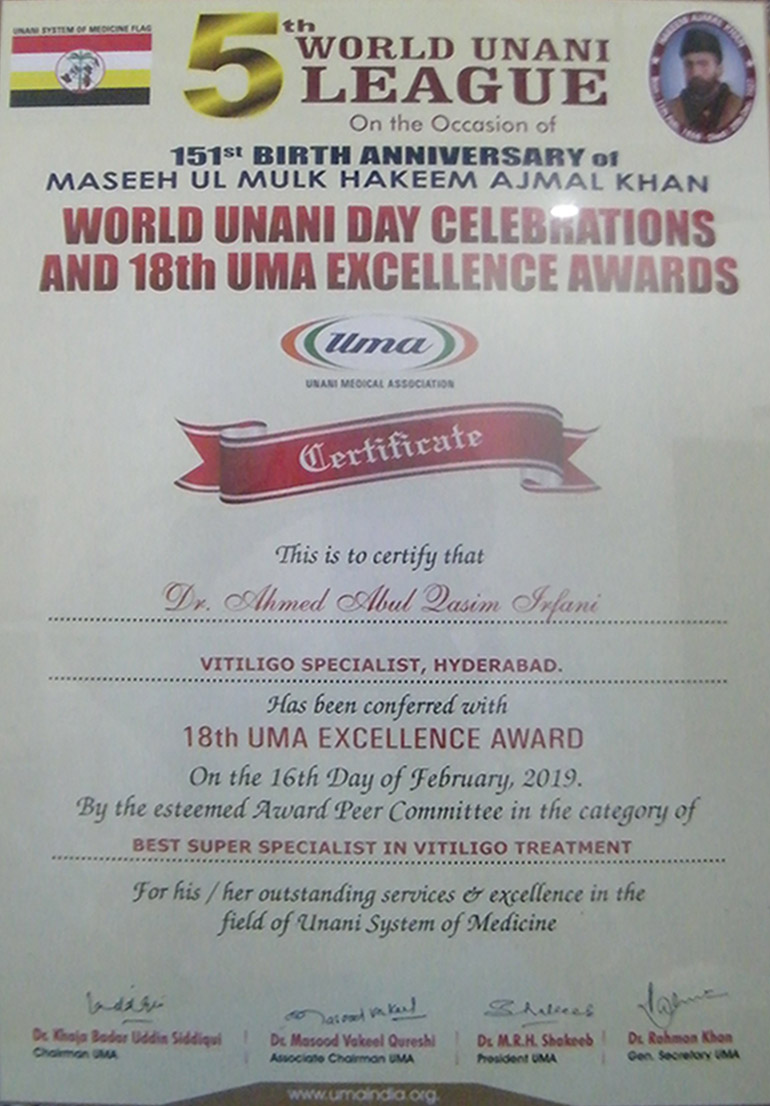 Dr. Ahmed Irfani has completed his B.U.M.S medical degree course in 1990 (1984-1990) from Osmania University and then pursued his Doctor of Medicine from UHS (University of Health Sciences, Vijayawada, AP) submitted his thesis “Clinical Study Of Vitiligo (Bars) and The Therapeutic Response Of Unani Medicine” in 1994. During his research was permitted to treat 50 patients but so huge the response was that nearly 200 patients took treatment at Government. Nizamia General Hospital, this was the first and the only time in the history of the hospital and college and till to this day no one has even broken that record. Once the budget for the medicines exhausted, Dr. Ahmed Irfani put his own money and prepared the medicines to be given to the poor and desperate people.