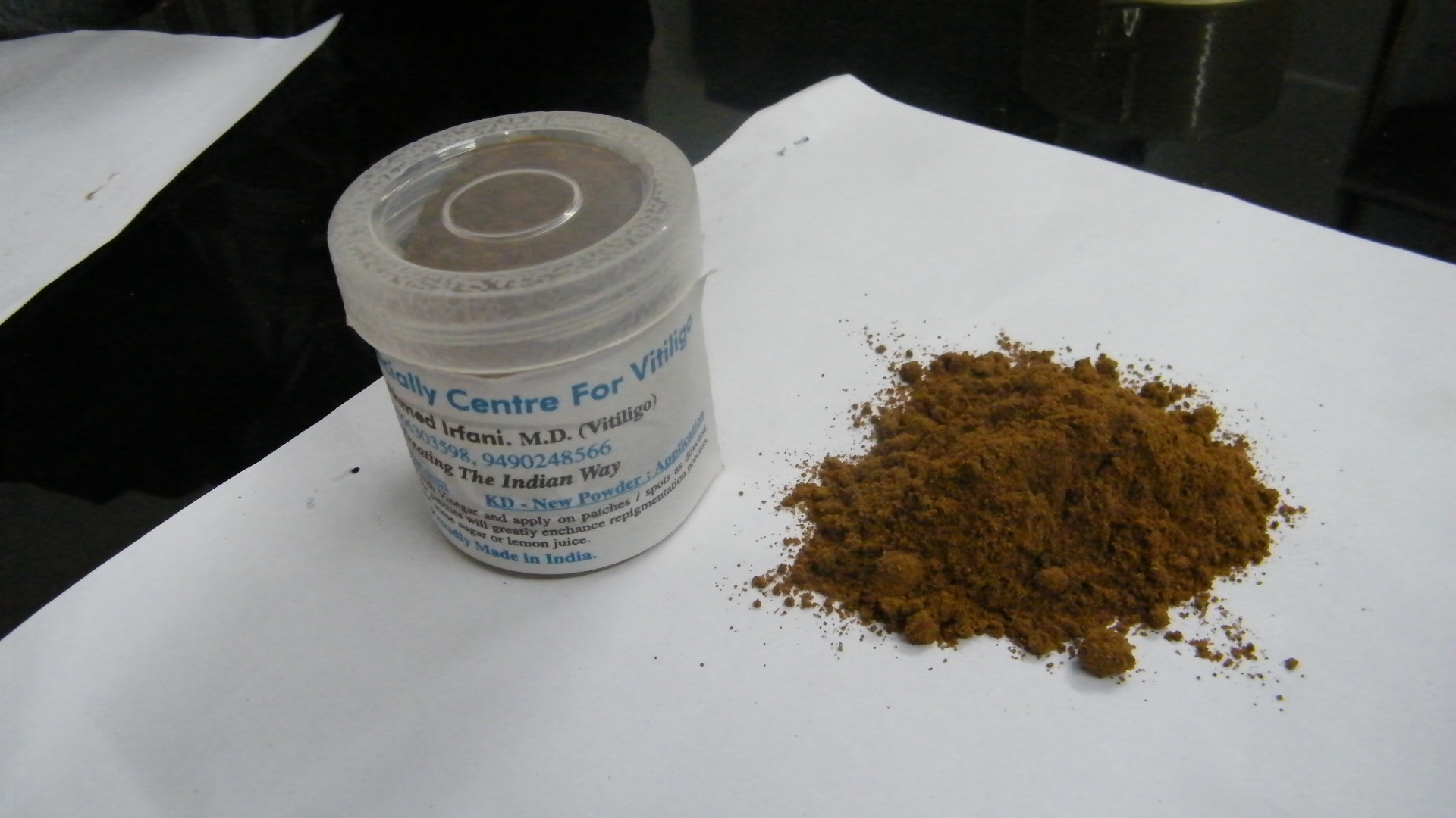 Again our star performer since 1991. Contains herbs which acts as skin irritant as well as which expels substance known to create white patches (Avicenna), when applied in right quantity changes skin color in about 8-10 applications (4-5 days) to either light or dark maroon, in some cases when mixed with fresh lemon juice changed color to light black. Doesn’t contain any chemicals or coloring agents. Through irritation the powder tends to stimulate the process of re pigmentation.